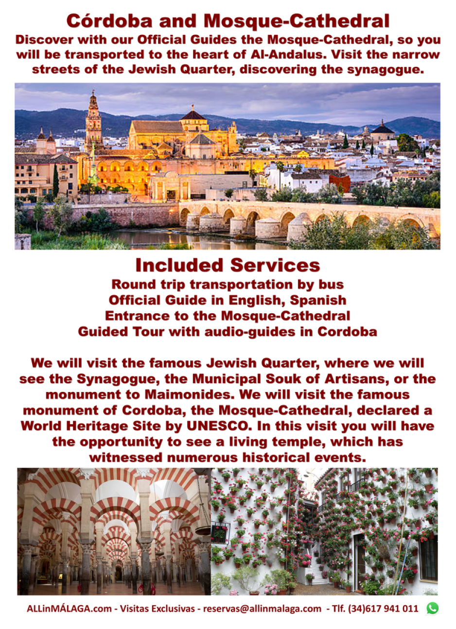 Descubra con nuestros Guías Oficiales la Mezquita Catedral, así se transportará al corazón de Al-Andalus. Visita las Callejuelas de la Judería, descubriendo la sinagoga.
